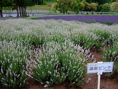 見本園として数種類のラベンダーが植えられています。「濃紫ピンク」という白っぽいラベンダーがありますが、濃紫3号の色違いということでこう命名したのでしょうか。咲き方や葉の形状、香りなど共通点は見当たらず別種のようです。身勝手なネーミングのような気がしますが。