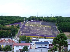 北星山町営ラベンダー園の全景。傾斜がきついため土の茶色い部分が目立ちます。