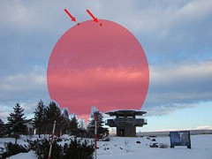 次に現地へと向かい、ようやくバルーンを確認できました。バルーンの位置を矢印で、赤い円はこのように見えるのではないかという私の想像です。向きも考慮して楕円のサイズも変えています。